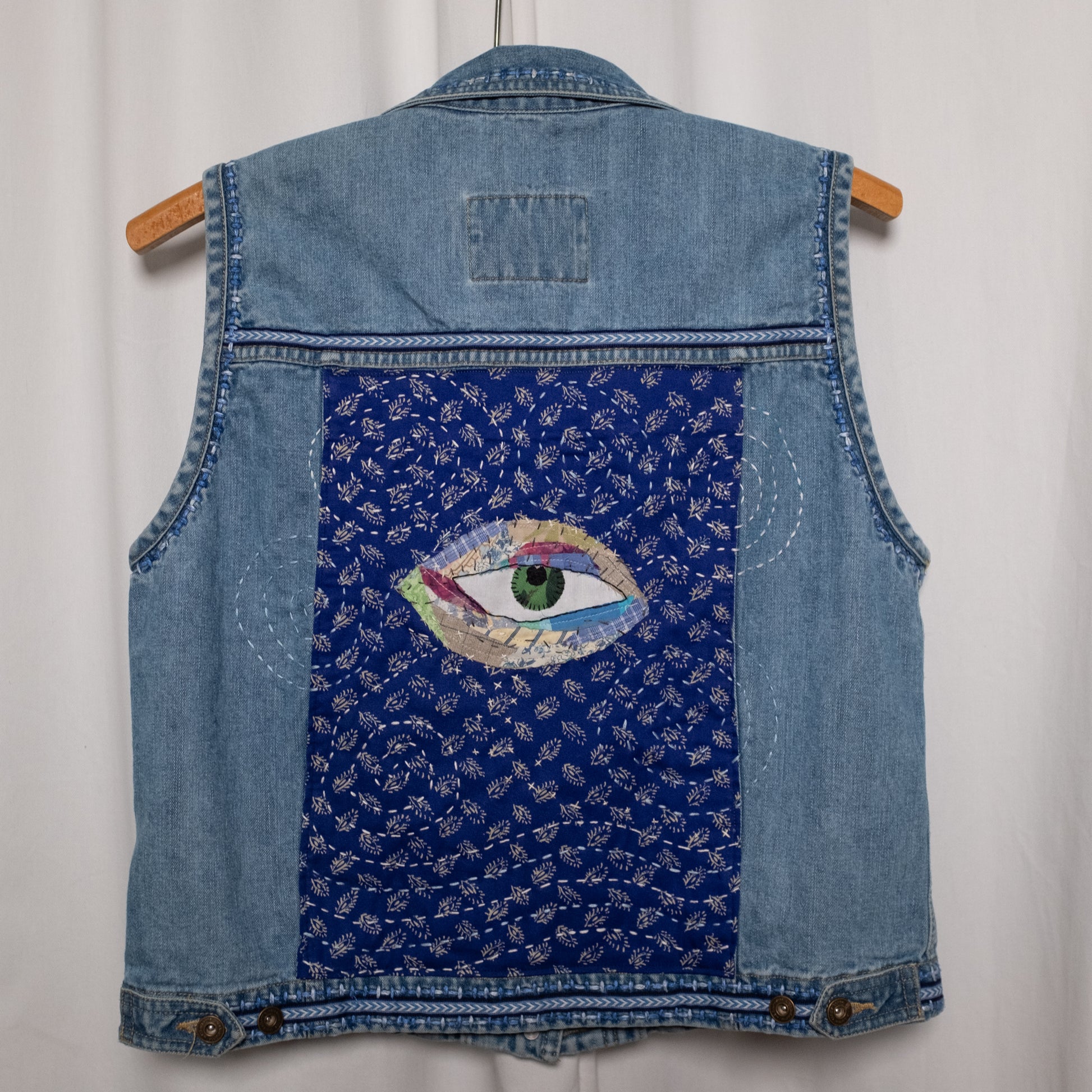 Liz Claiborne vintage light denim vest with original embroidery stitching, hand-quilted with our STAY AWAKE eye design using fabric and clothing scraps and Japanese sashiko-style hand embroidery.